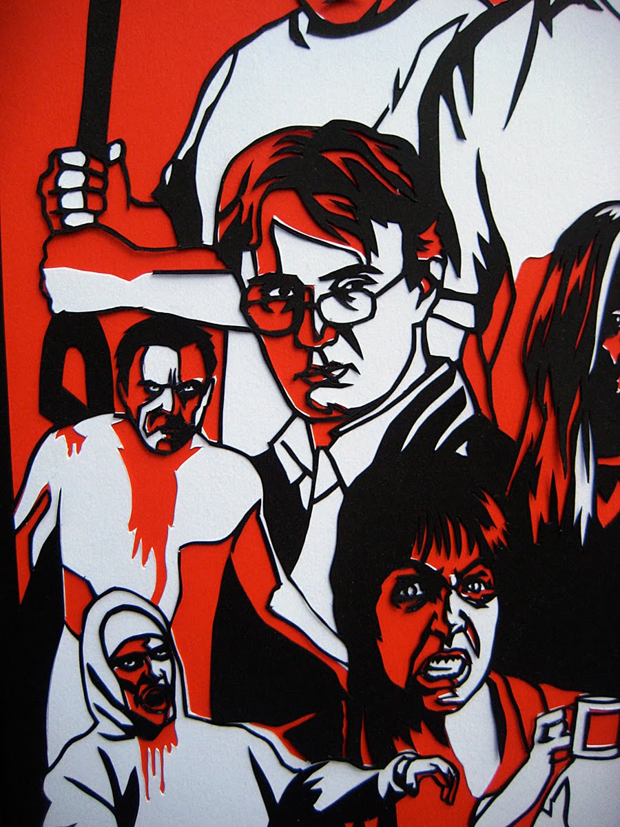 Here's some better shots & close ups of my Shaun of the Dead papercut. Tyler Stout and movie poster legend Drew Struzan were a big influence on the composition of this, I tried to pick out key characters at iconic moments as well as some of my own favourite moments from the film. cornetto.